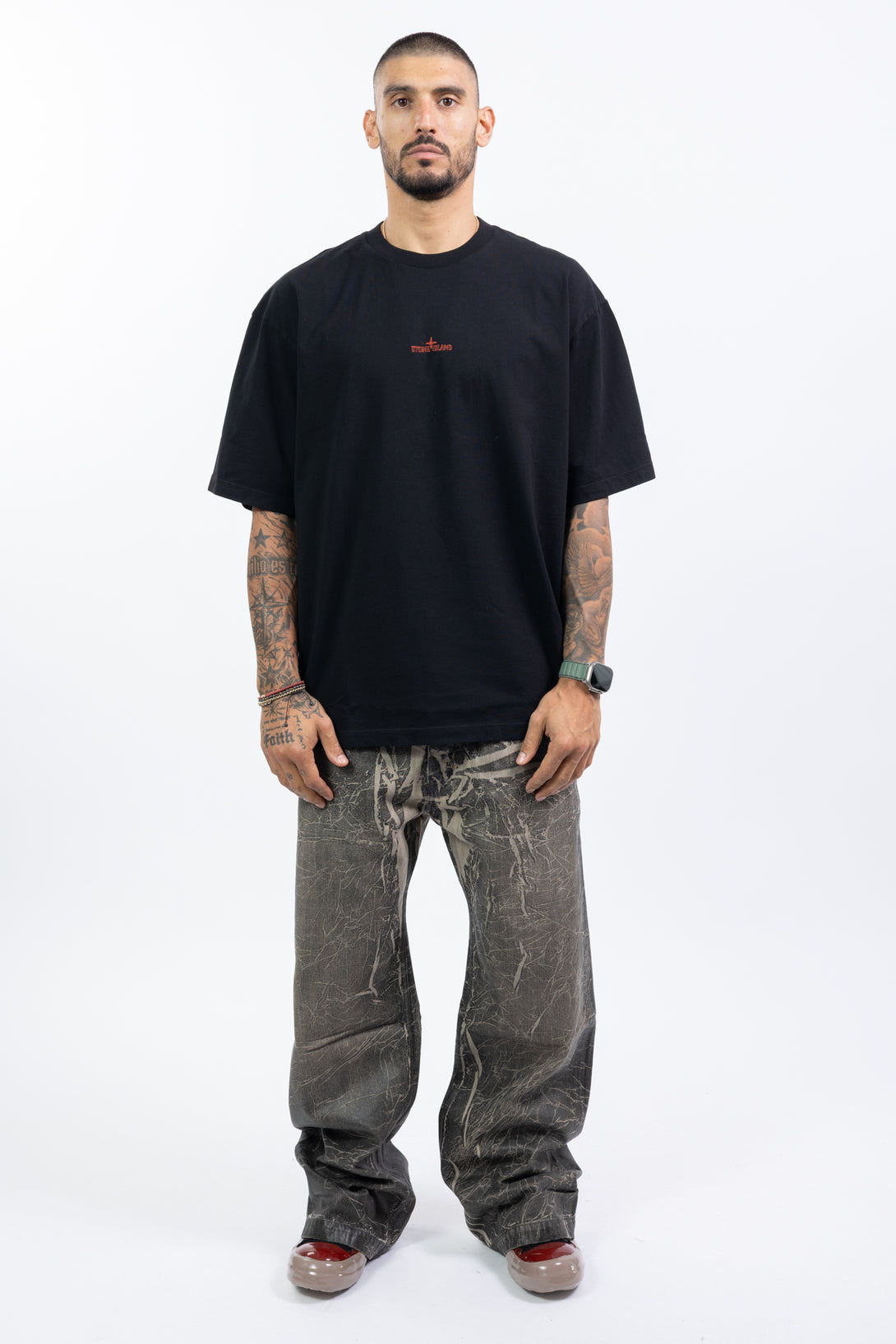 THIS MEDIUMWEIGHT WASHED FOIL DENIM IS MADE ON A 13OZ JP BLACK AND NATURAL DENIM. THE READY GARMENT IS BLEACHED INTO A DIRTY PEARL COLOR, A BLACK FOIL OVERLAY IS THEN APPLIED AND FINALLY THE GARMENT IS WASHED TO ACHIEVE THE IRREGULAR LOOK.