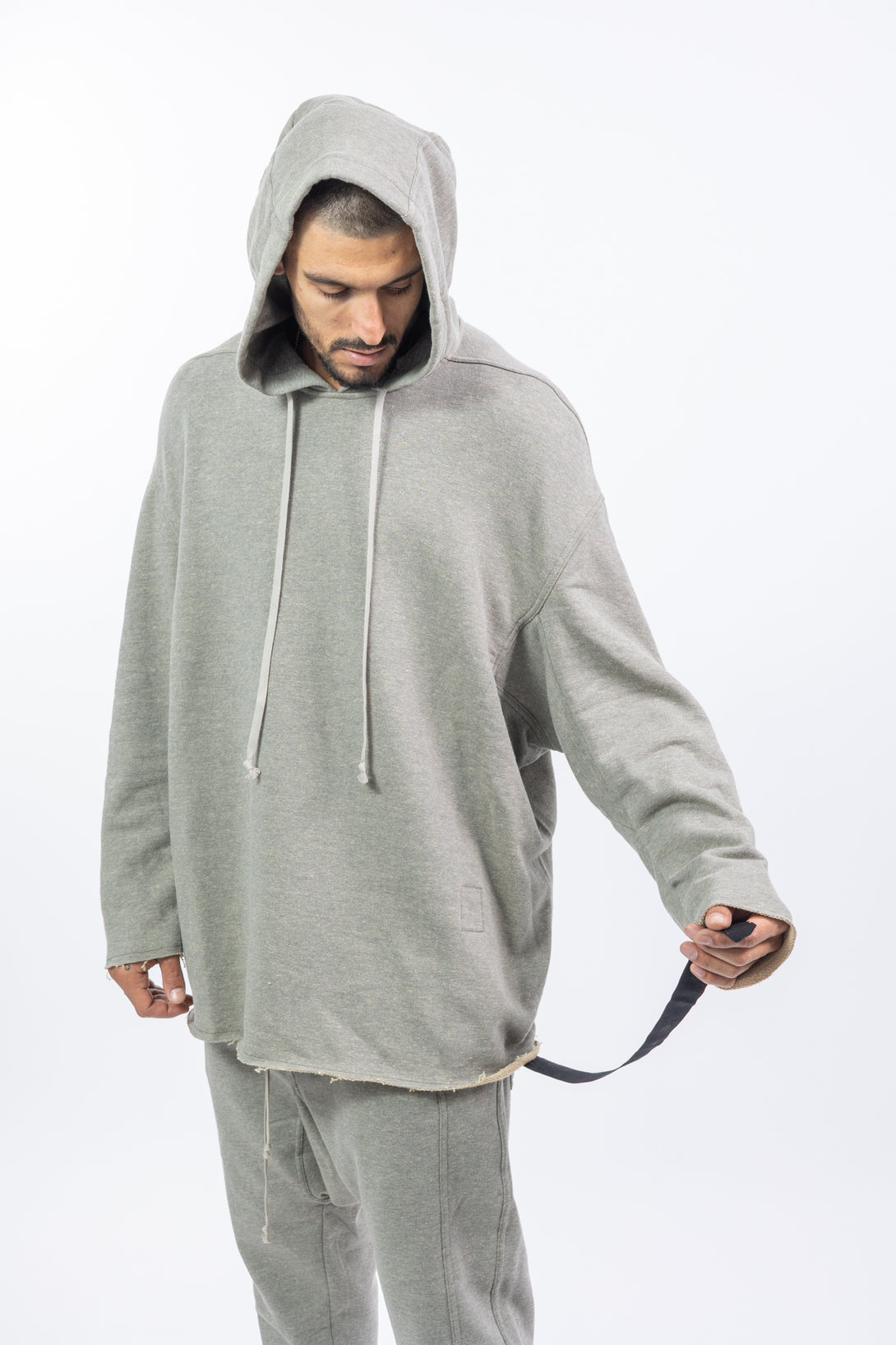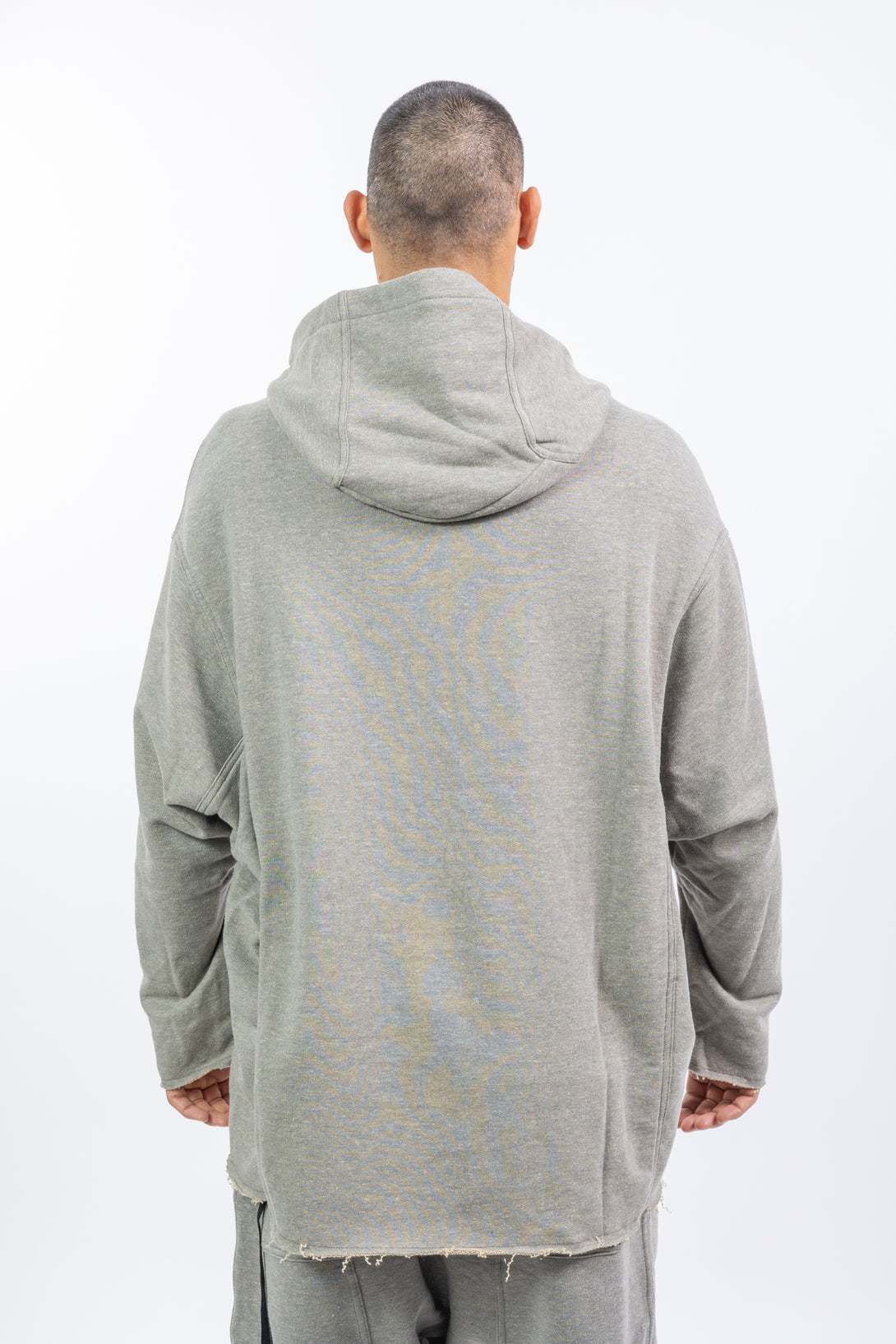 THIS PETER HOODIE IS HIP LENGTH, DIPPING SLIGHTLY AT THE BACK, WITH AN OVERSIZE FIT. IT HAS LONG SLEEVES WITH LOW SHOULDERS, A DROPPED ARMHOLE, A HOOD WITH DRAWSTRING AND RAW CUT HEMS. IT FEATURES A YOKE AND DIAGONAL SEAMS WITH TOPSTITCHING ON THE FRONT AND BACK BODY.
