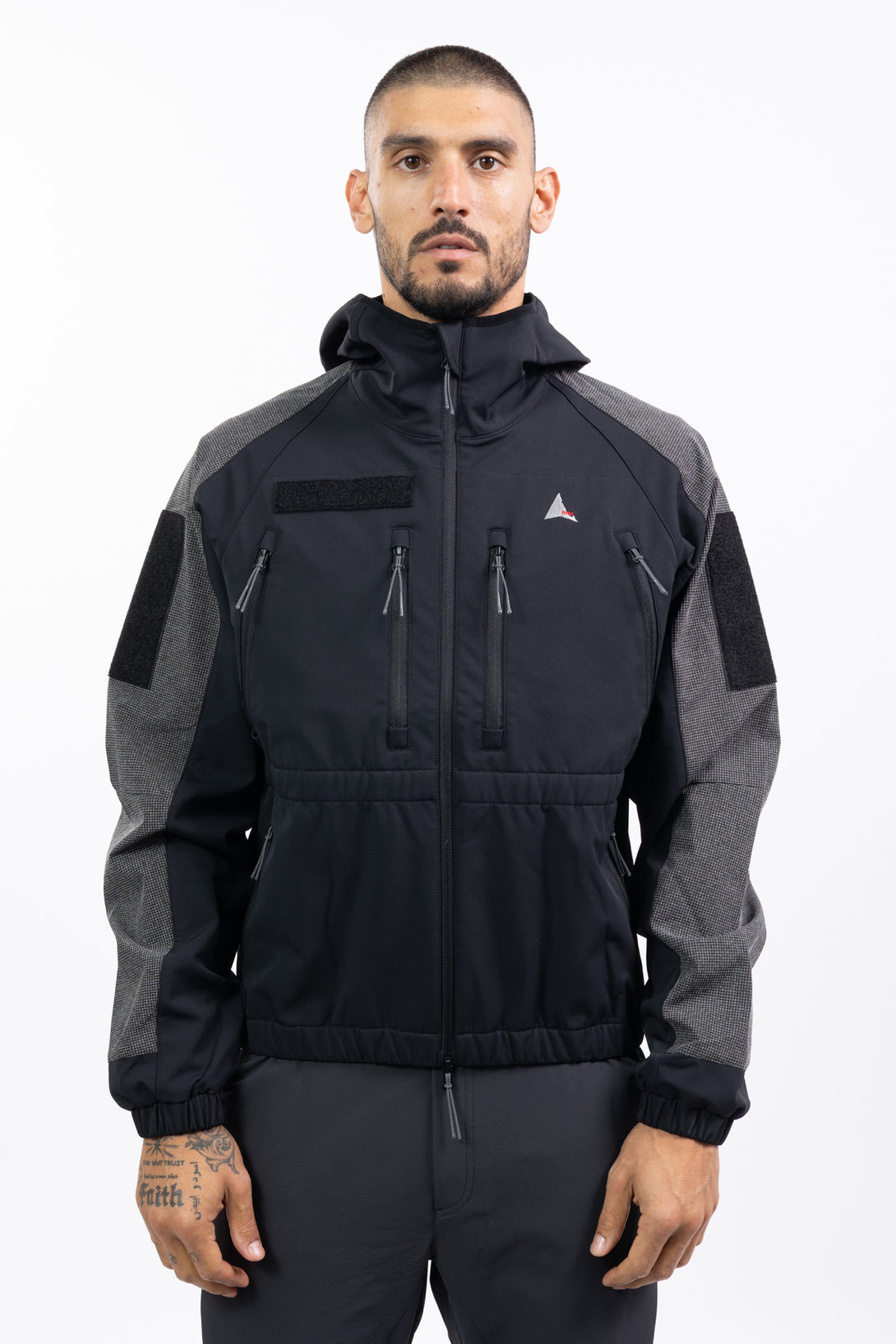 The Testudo Reinforced Softshell Jacket in black color is made from brushed heavy water-repellent softshell fabric, offering excellent protection from light rain and wind. Designed with a regular fit, it features anti-abrasion fabric on the sleeves, bottom back, and upper hood, along with velcro patches on the sleeves. Features include six front-zippered pockets for extra storage, an elasticated body hem and cuffs for a tailored feel, and an embroidered ROA logo on the chest.