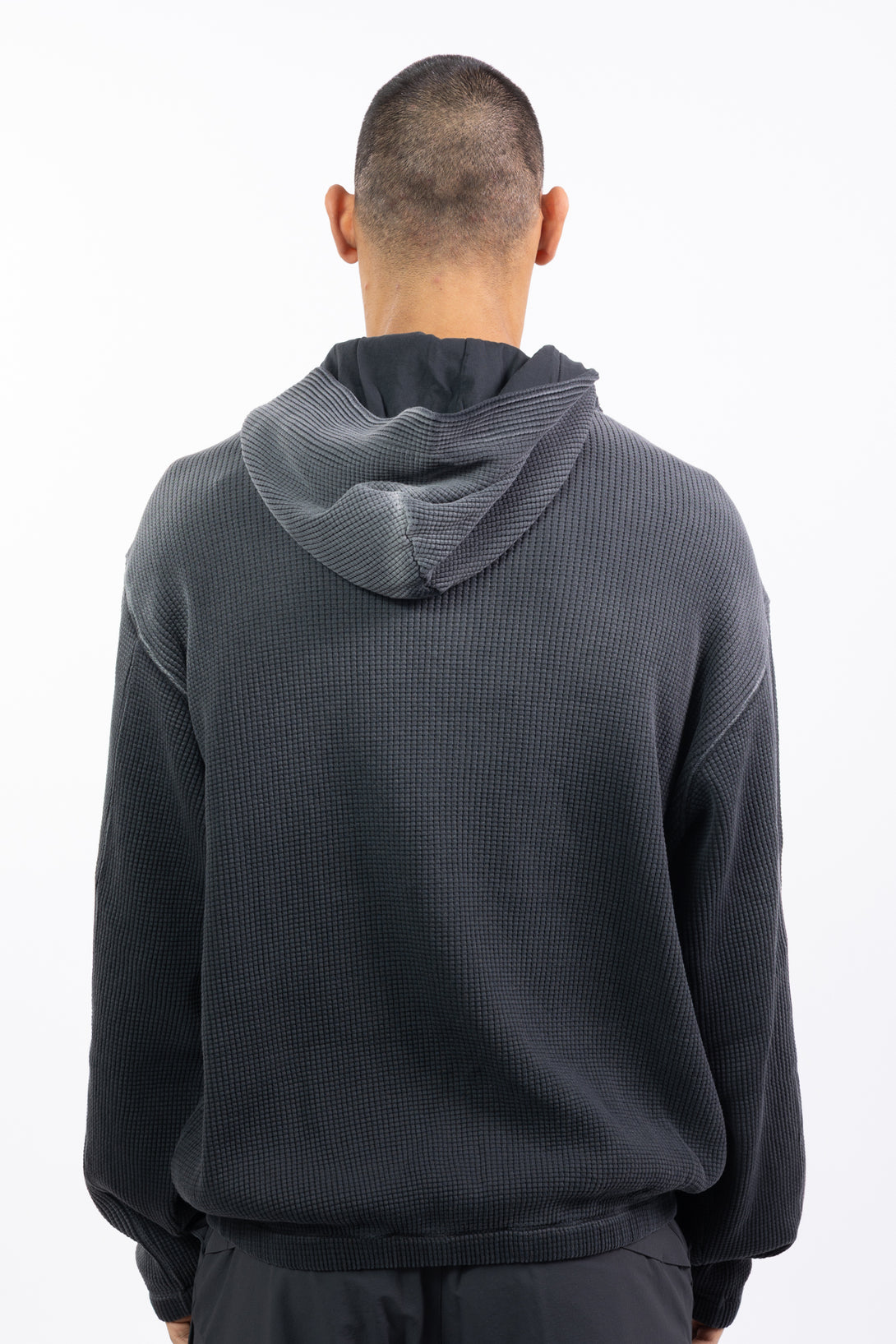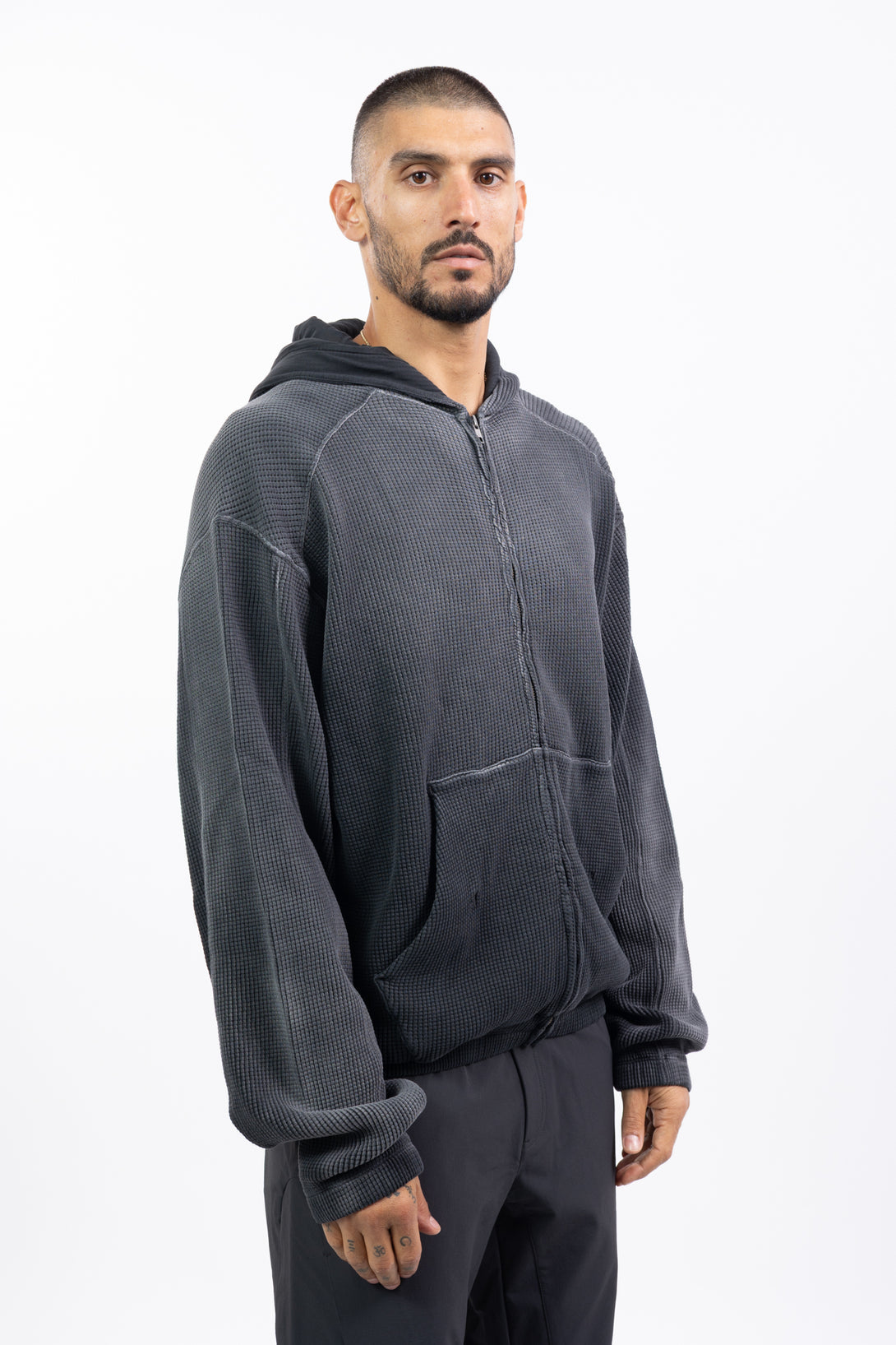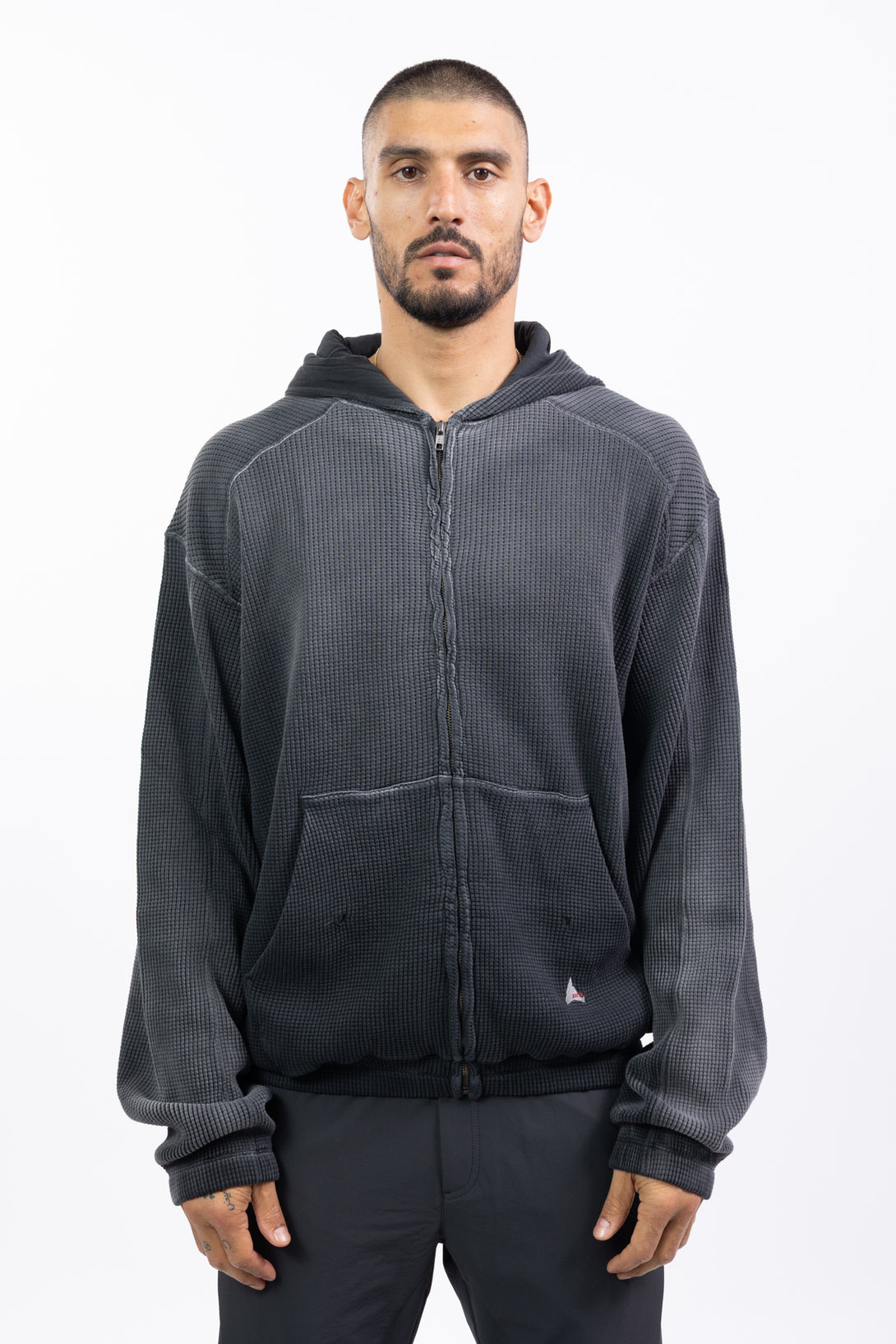 The Bee Sun Faded Waffle zip-up hoodie in black color is crafted from faded, heavy waffle jersey. Designed with a boxy fit for a relaxed silhouette, it features a zipped center front for easy layering. Elasticated cuffs and hem provide a snug fit, while the embroidered ROA logo on the front pocket adds a subtle touch of detail.