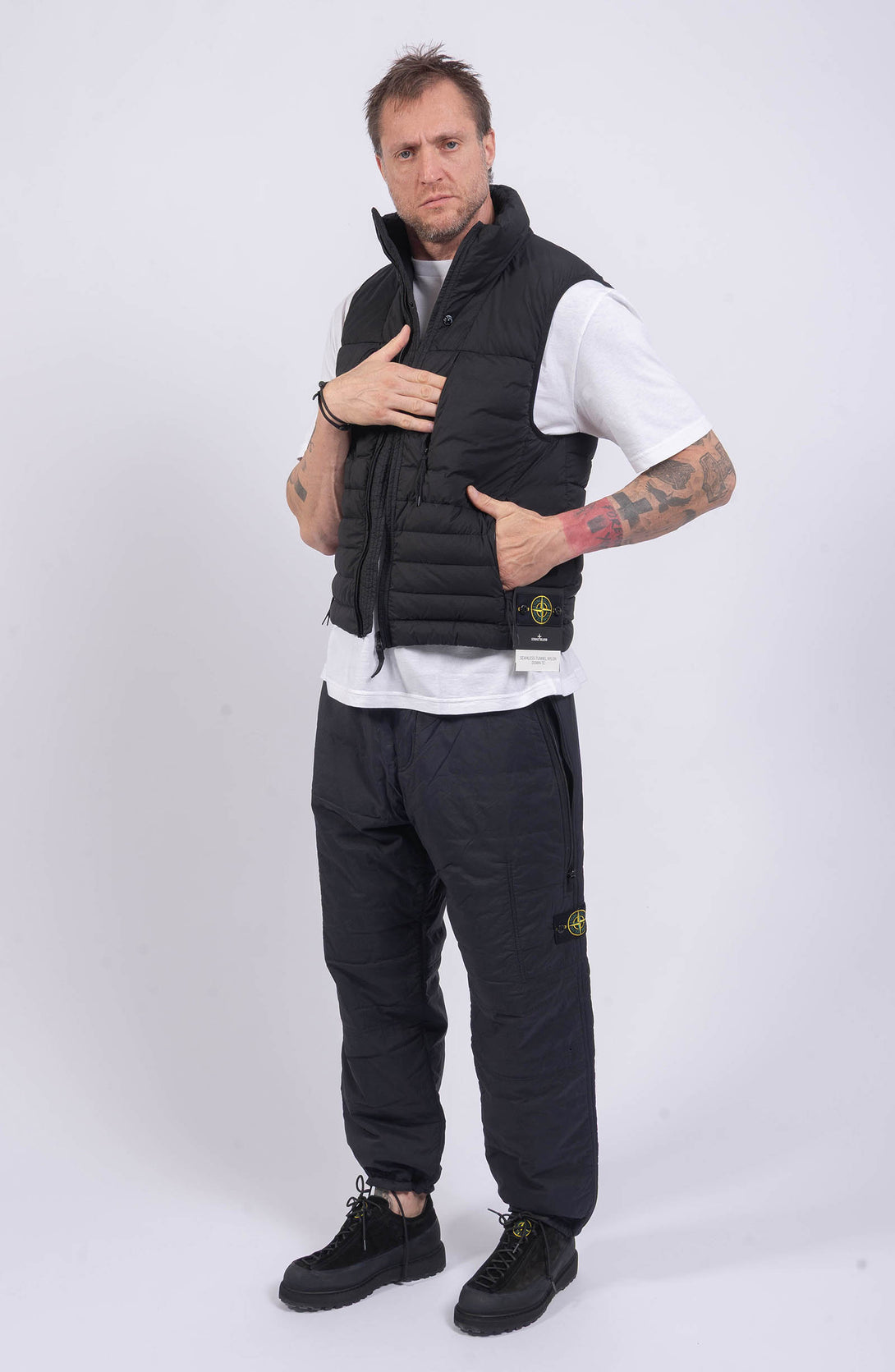 Down vest in a single layer of light stretch nylon with seamless tunnels for improved feather hold, featuring invisible zip pockets and a padded collar. Garment dyed with anti-drop.