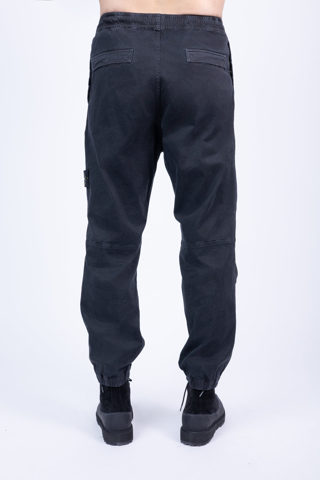 Standing hand pockets. Two back pockets with snap under fixed flap. On left leg, patch pocket with diagonal entrance and zip under fixed flap and Stone Island badge. Shaped knees. Elasticated cuffs. Elasticated waistband with inner drawstring. Zip fly. Loose fit.